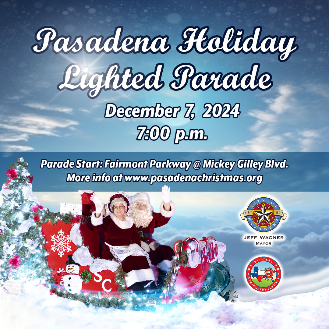 Join us tomorrow, December 7, 2024, at 7 PM for the City of Pasadena's Holiday Lighted Parade! Our talented students, including multiple bands from across the district, will perform alongside countless of community floats and rides! The parade will start at Fairmont Parkway @ Mickey Gilley Blvd.Β For more details, visit Pasadenachristmas.org.
