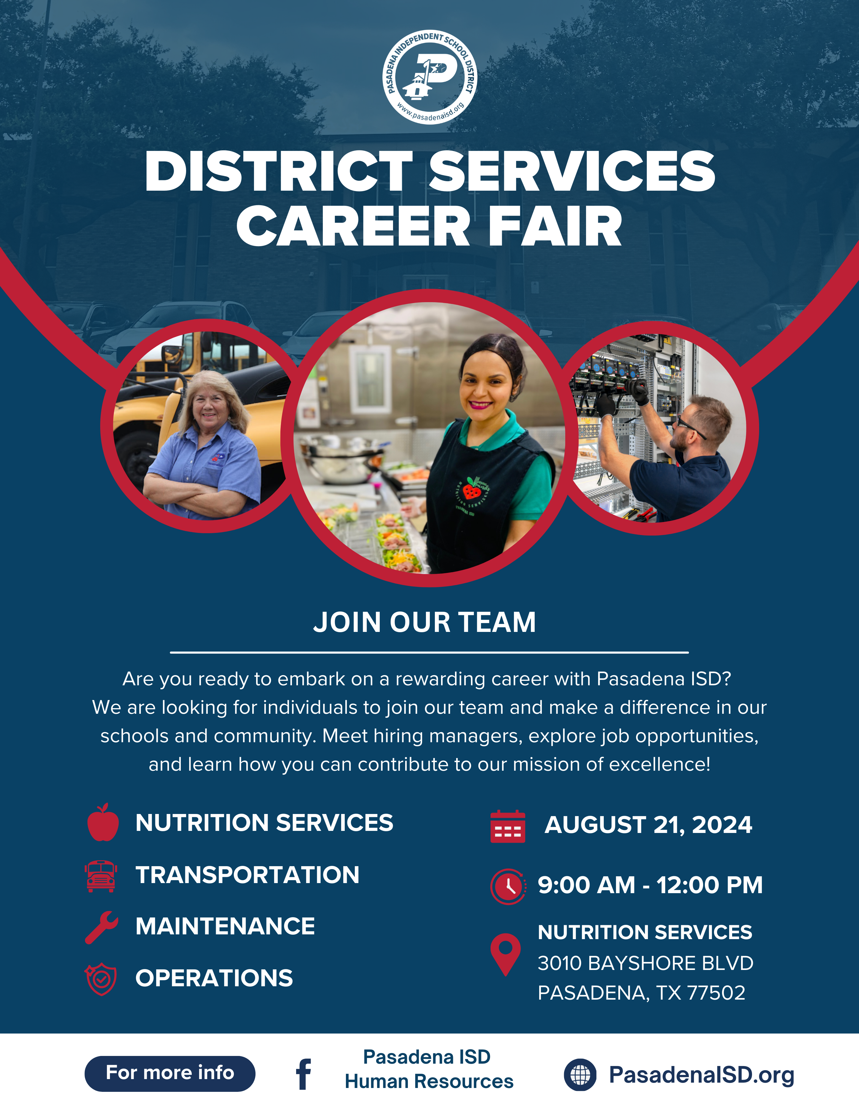 Join us for the Pasadena ISD District Services Career Fair tomorrow, August 21, 2024 from 9 a.m. to 12 p.m. at the Nutrition Services building.