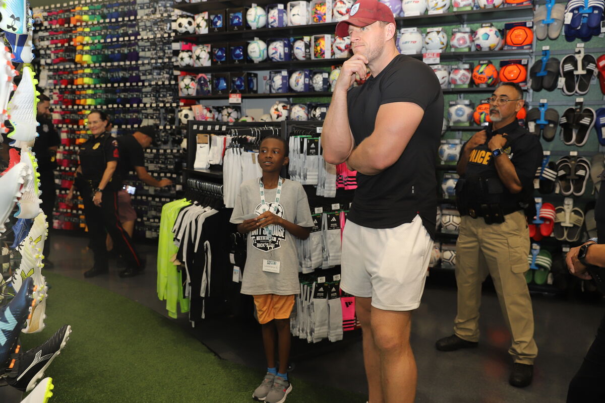 JJ Watt took the time to walk around the store with each student as they shopped. Although the former NFL star would pause for the occasional photo with fans, he spent the majority of his time assisting the Bondy students in selecting the best athletic gear to suit their needs.